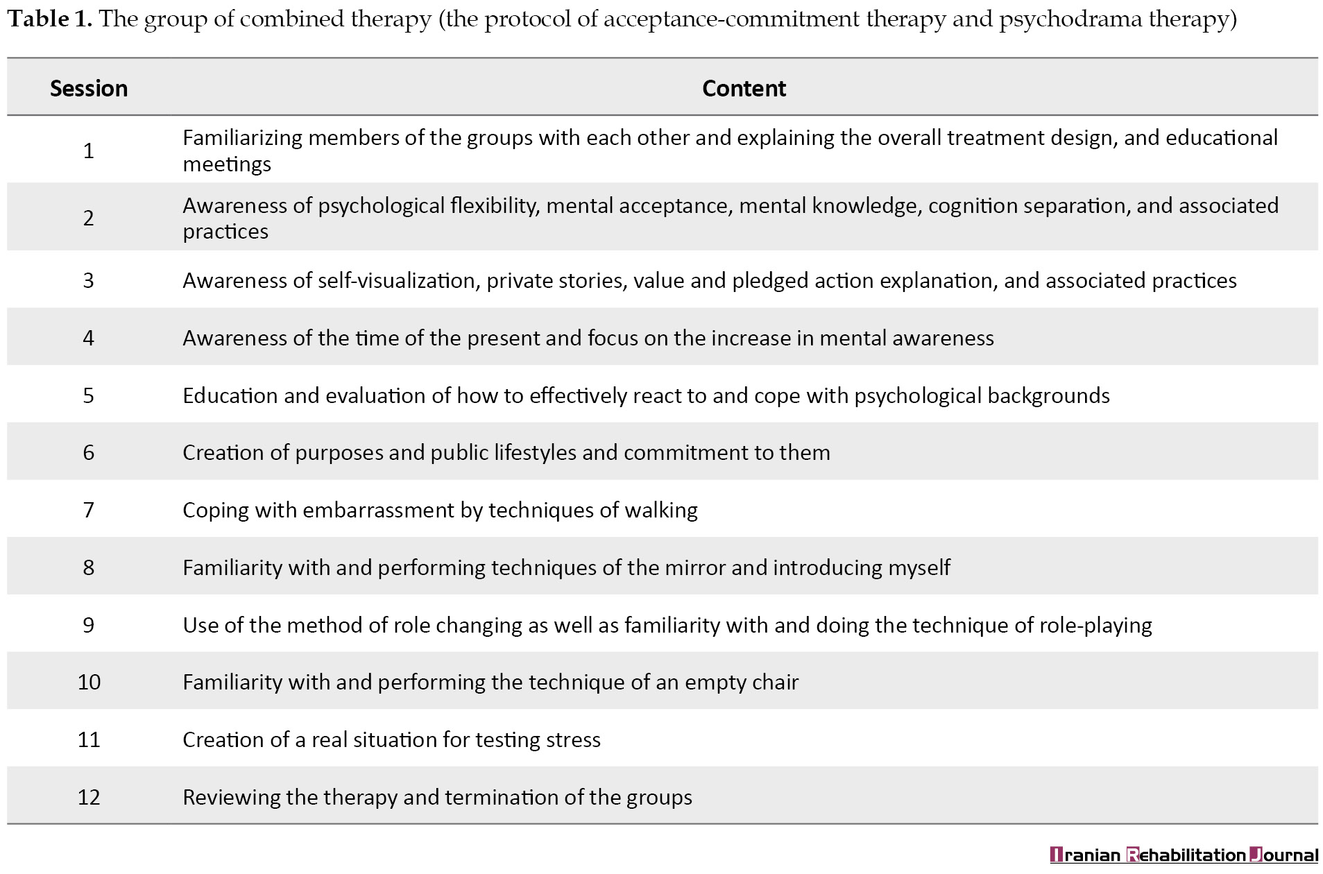 Table 1) in 12 sessions; each meeting lasted 90 min (two sessions every week) according to the protocol for the SAD [14-16], determined and developed by the researcher. The first and second control groups were provided with ACT (