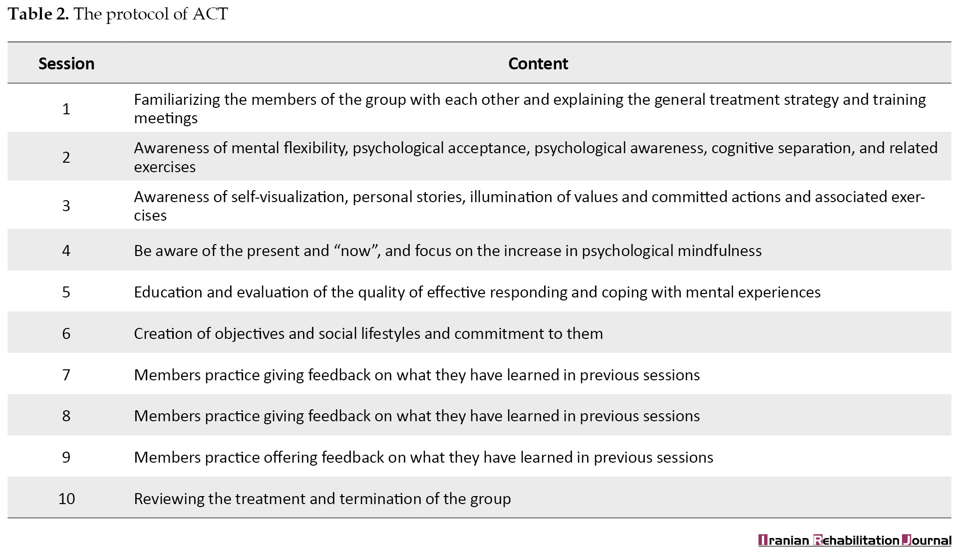 Table 3), while the third one was provided with no treatment. A pre- (before the treatment started) and a post-test (after the treatment completion) were considered to be done so that questionnaires were filled in all groups, and an independent evaluator led the pre-test and post-test assessment. The third group of control, which was not provided with any therapy during the research, received ACT psychotherapy after the end of the study. It is notable that throughout the investigation, one participant from the group of intervention and one from the ACT group did not continue their therapy sessions due to interference with the sessions during their work hours.