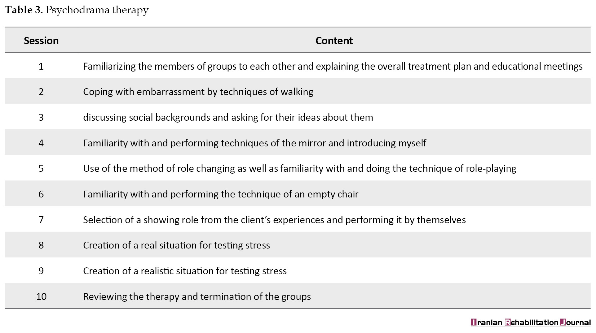 Table 2) and therapy based on psychodrama, respectively, in 10 sessions (