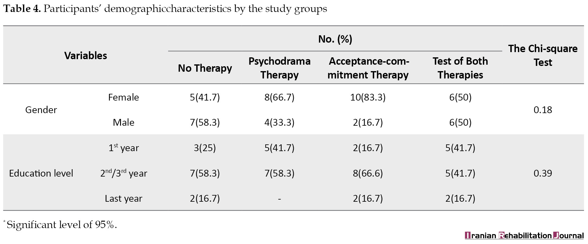 In the research, 48 nurses with social anxiety were divided into 4 groups of no treatment, psychodrama, ACT, and therapy based on the combination of the two methods. The Mean±SD age in the psychodrama group was 30.5±6.34 years, in the ACT group, 30.75±5.83 years, in the combined therapies group, 29.50±19.58 years and in the no therapy group, 31.5±6.16 years. The groups had the same number of participants, and their sex (P=0.18) and education level were similar too (P=0.39). Individuals’ demographic data by the groups of the research are presented in