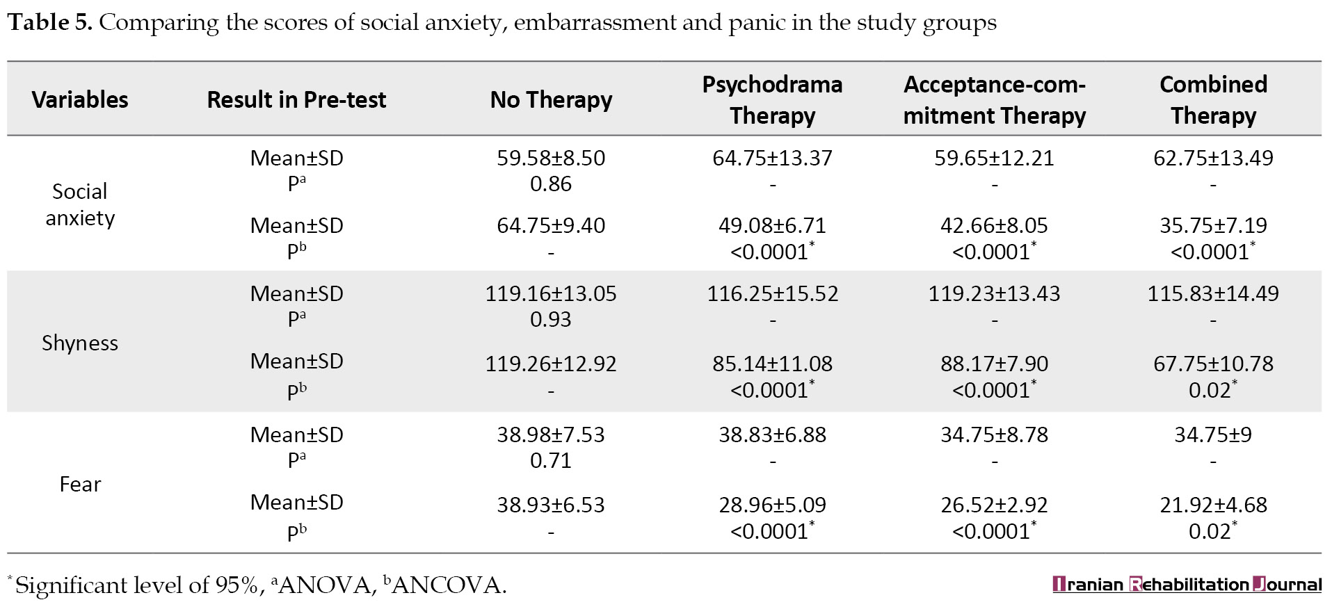The findings exhibited a substantial diminution in the total score of the SAD and its dimensions in all three groups in such a way that the Mean±SD social anxiety score in the psychodrama group was 63.75±11.37 before the intervention and 50.08±7.75 after the study period. However, the Mean±SD social anxiety score was 60.21±10.71 before the intervention and 43.66±7.05 after the study in the ACT group. In the combined therapy group, before applying intervention and after that, the Mean±SD social anxiety scores were found to be 61.75±11.49 and 34.75±8.19, respectively. A noteworthy difference (P=0.86,