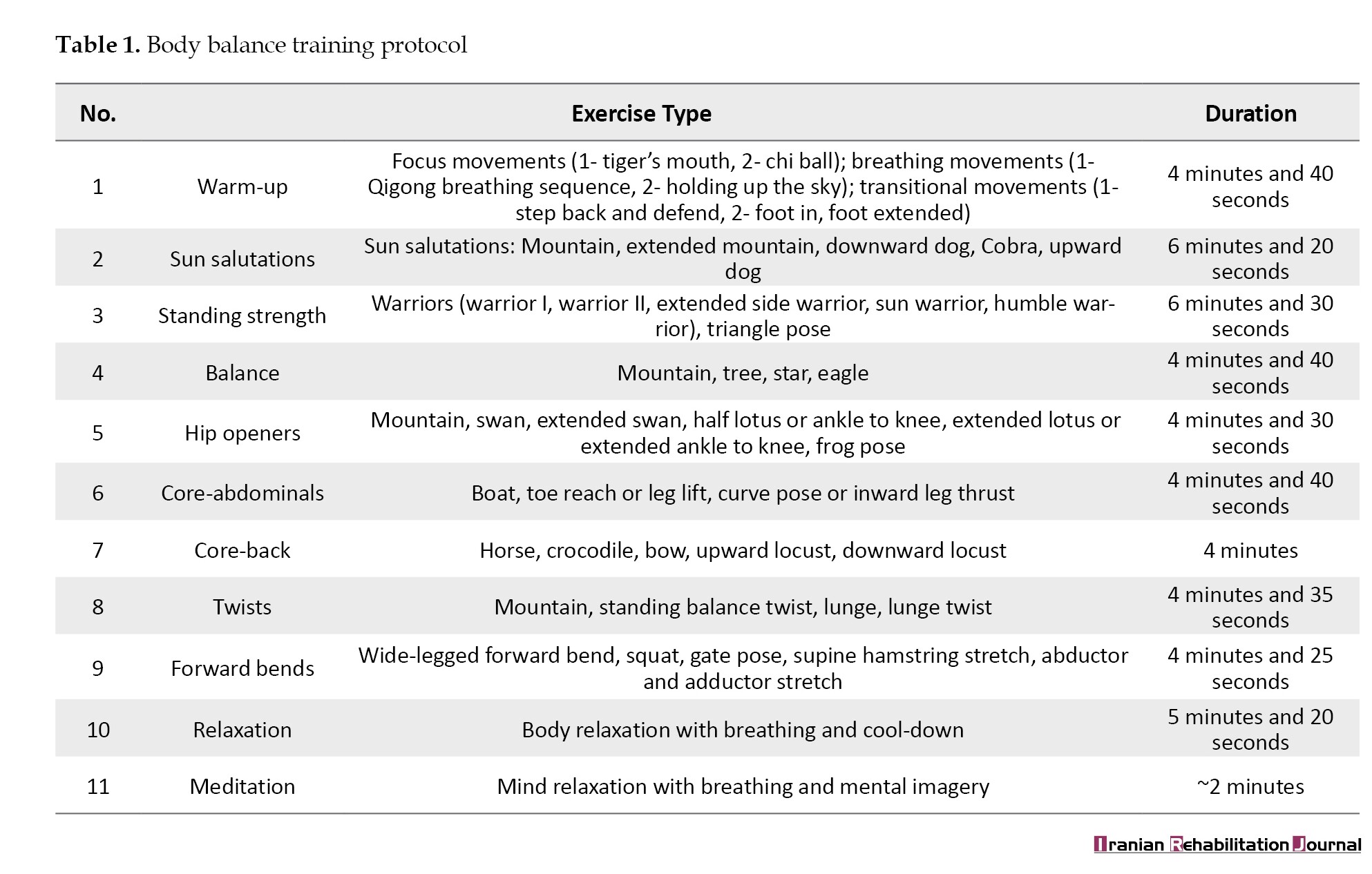 The body balance training protocol implemented in this study was adapted from a program by Khan et al. (2008), as referenced in the operational definition of body balance [28]. This protocol was selected because it combines elements of yoga, Tai Chi, and Pilates, specifically structured to improve balance, flexibility, and neuromuscular control, which are commonly impaired in patients with multiple sclerosis. Additionally, the exercises emphasized low-impact, controlled movements, making them particularly suitable for individuals with mild to moderate MS-related disability. The 8-week body balance training program consisted of 24 sessions, with participants attending three 60-minute sessions per week. Each session was organized into distinct phases: Warm-up, strength and core stability training, balance and flexibility exercises, and relaxation. The exercise protocol was progressively individualized throughout the intervention period in response to each participant’s performance capacity and tolerance levels. To promote gradual progression while minimizing the risk of injury, tailored modifications were implemented, including adjustments, such as limiting the range of motion, altering the base of support, or incorporating low-level challenges (e.g. performing balance exercises with eyes closed). Table 1 presents a detailed summary of the training components.