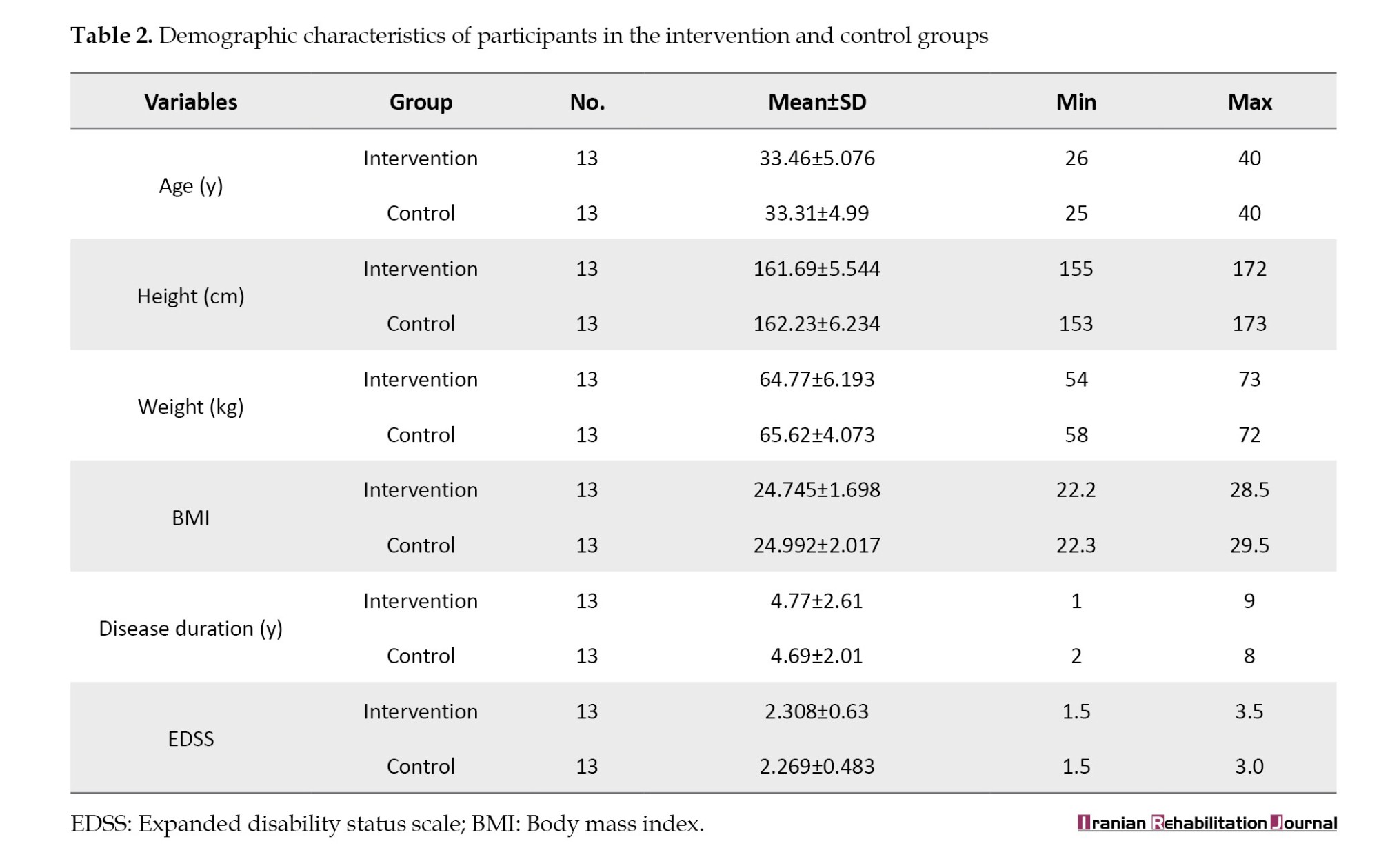 This study utilized a single-blind, randomized controlled trial with a pre-test-post-test design, featuring an active intervention group and a control group. In this design, outcome assessors were blinded to group assignments to minimize assessment bias. Initially, 30 female participants diagnosed with relapsing-remitting MS (RRMS) (mean age=33.38±4.99 years) were recruited from the MS community in Karaj City, Iran, after obtaining informed consent. Participants were randomly allocated to either the intervention group (n=15) or the control group (n=15) using a computer-generated randomization sequence with allocation concealment ensured through sealed, opaque envelopes handled by an independent researcher. During the study, four participants dropped out, two from each group, due to relocation, engagement in alternative exercise programs, or loss of contact, resulting in a final sample of 26 participants (13 per group). No significant differences in dropout rates were observed between the experimental and control groups, and the reasons for dropout were consistent across both groups. Therefore, the dropout pattern is unlikely to influence the study’s overall results. Only data from participants who completed the study were included in the final analysis; no intention-to-treat approach was applied. The inclusion criteria included female patients aged 25–40 years. While the 15-year age range may introduce variability, this range was selected to capture a broad representation of adult women with RRMS, avoiding extreme age-related differences that could confound results. Additionally, potential age-related differences were considered and controlled for in the statistical analysis, ensuring that the effects observed are not significantly influenced by age. More inclusion criteria include a confirmed diagnosis of RRMS by a neurologist. Expanded disability status scale (EDSS) score below 4 (indicating mild to moderate disability) [34], no participation in body balance training for at least two months prior to the study, no engagement in other physical activities during the study period, no concurrent psychiatric, psychotherapeutic, or cognitive rehabilitation interventions, no diagnosis of additional neuromuscular disorders, no use of medications affecting muscle spasticity or fatigue, no participation in alternative treatment modalities during the study, no disease relapse within two months prior to study enrollment.
