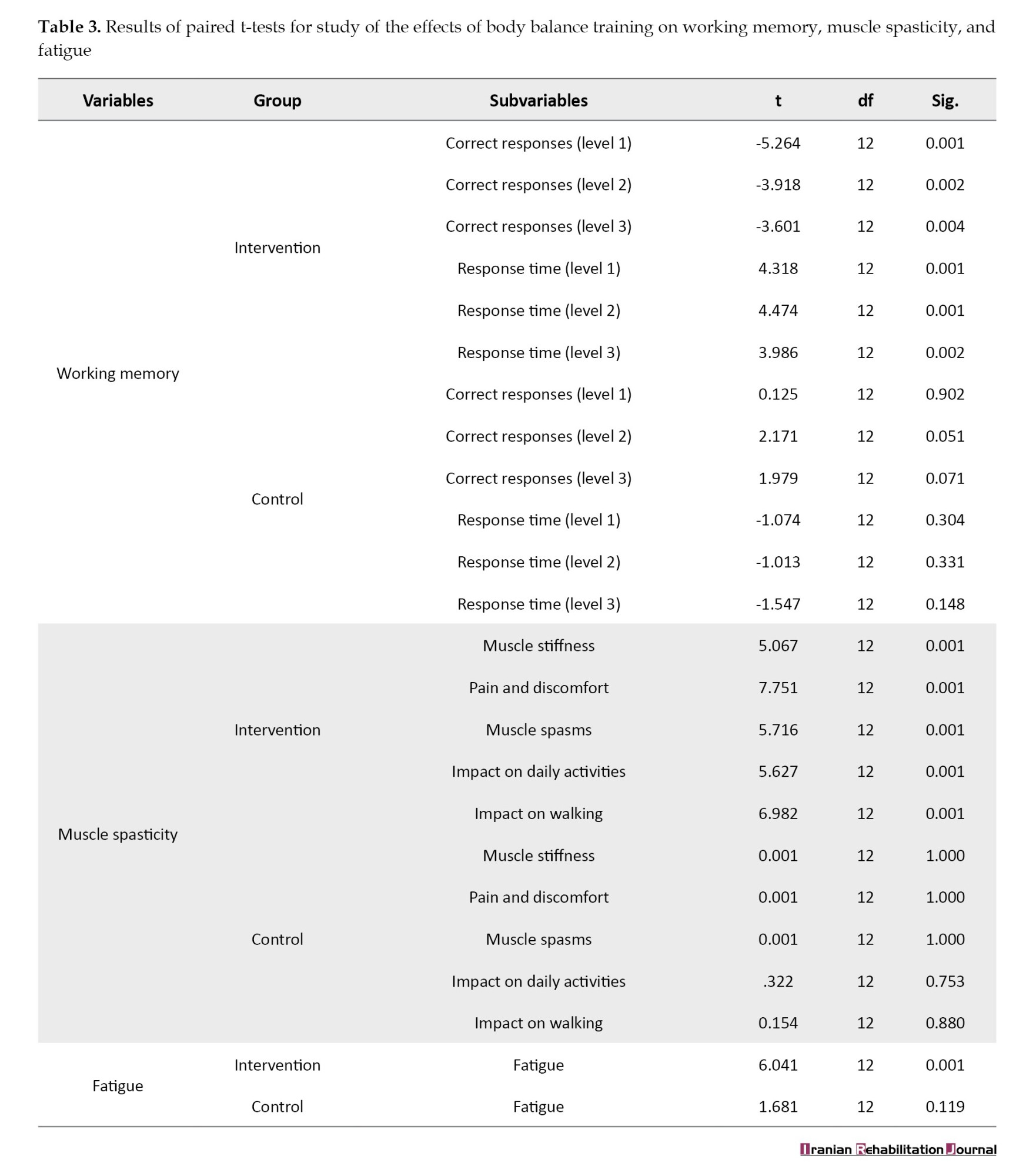 Baseline assessments were conducted one week prior to the start of the intervention at the Rehabilitation Research Laboratory, University of Tehran. These assessments included working memory (via the N-back test), muscle spasticity (via selected MSSS-88 subscales), and fatigue (via the FSS questionnaire). All assessments were conducted by trained evaluators with experience in neuropsychological testing in MS populations. Following baseline evaluations, participants were randomly assigned to either the intervention or control group. The intervention group participated in an 8-week body balance training program, held three times per week at a standardized local sports facility equipped with accessible flooring, temperature control (21-23 °C), and MS-friendly infrastructure. Each 60-minute session was structured into distinct phases: Warm-up, strength, balance, flexibility, core strengthening, and relaxation, with progressive adaptations based on participant feedback and performance. The program was supervised by a certified physiotherapist with specialization in neurorehabilitation and at least five years of experience working with MS patients. Exercises were drawn from yoga, Tai Chi, and Pilates, and were tailored to individual physical limitations using support tools (e.g. chairs, walls) when necessary. Participants who demonstrated ≥80% success in task completion or self-reported comfort were advanced to slightly more challenging versions of the same exercises. The control group received standard care, which consisted of adherence to prescribed MS medications, neurologist follow-ups every 8–12 weeks, and general lifestyle guidance. No structured exercise or physiotherapy programs were included in the standard care. All participants completed the post-test immediately after the intervention, using the same measures and blinded procedures as in the pre-test. Adverse events were monitored using session checklists and weekly self-reports. No serious adverse events occurred. No follow-up assessments were planned beyond the immediate post-intervention phase; however, future research is recommended to explore long-term effects. Statistical analysis was conducted using SPSS software, version 27, employing paired t-tests for within-group comparisons and analysis of covariance (ANCOVA) for between-group comparisons, adjusting for baseline scores. A significance level of P<0.05 was used.