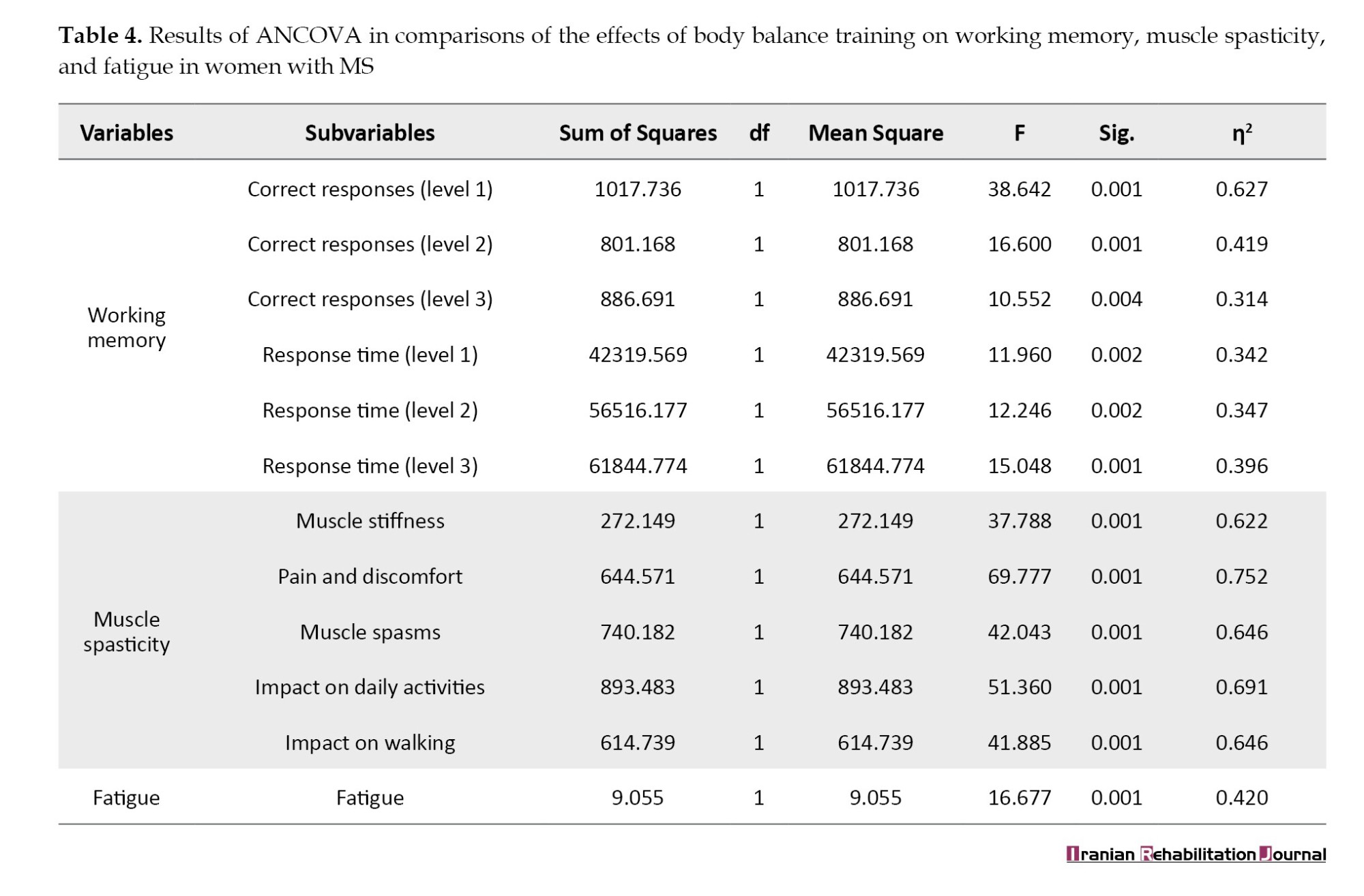 The ANCOVA results (Table 4) revealed significant between-group differences across all measured variables, including working memory performance, muscle spasticity, and fatigue (P<0.05). Eta squared (η²) values indicated moderate to large effect sizes for all outcomes, suggesting a meaningful impact of the body balance intervention. Regarding safety monitoring, no adverse events were reported during the intervention period, supporting the feasibility and tolerability of the body balance training protocol for individuals with MS.