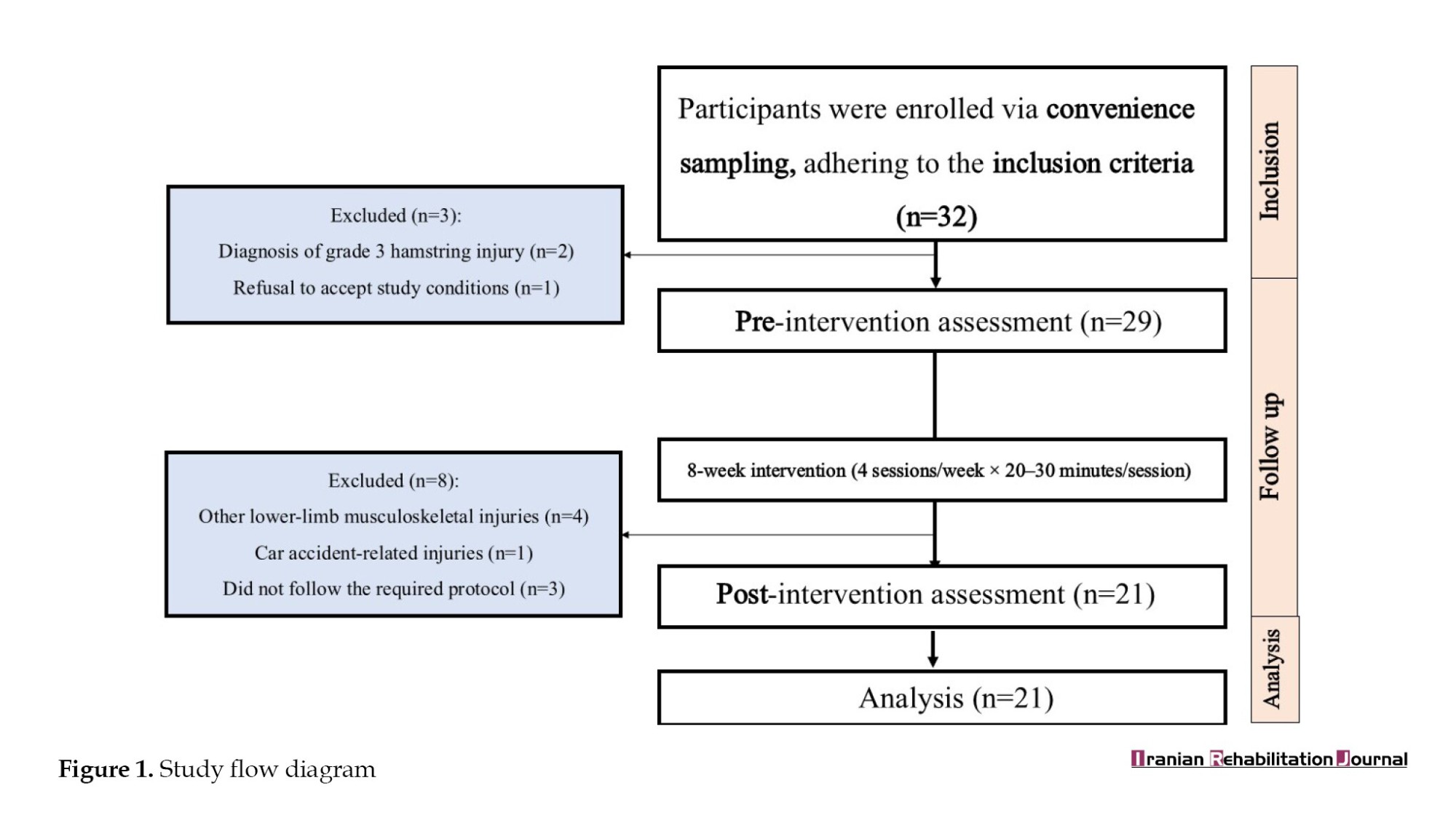 A priori power analysis (G*Power software, version 3.1.9.7) indicated a required sample size of n=28 to detect a medium effect size (d=0.6) in hamstring strength gains with 80% power (α=0.05). To allow for a 15% dropout, 32 participants were recruited.