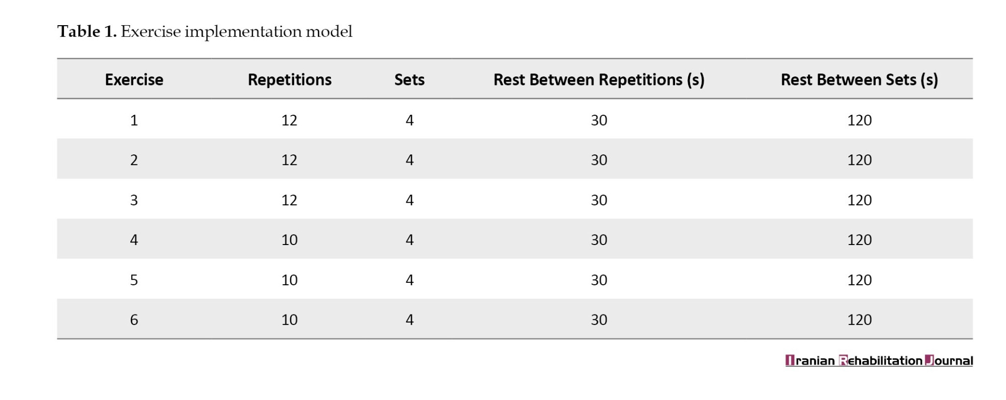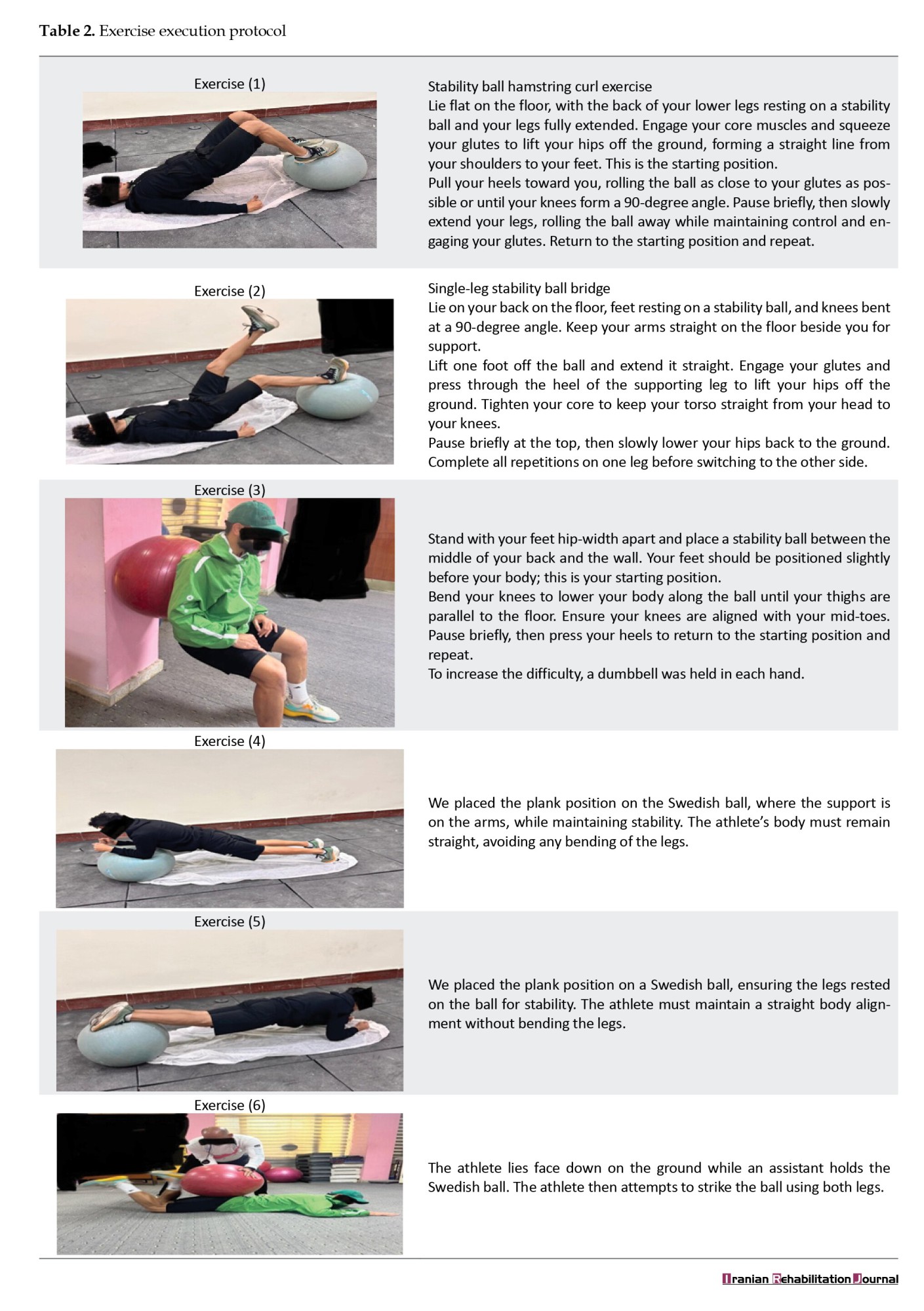 The rehabilitation program comprised Swiss ball exercises to improve hamstring flexibility, elasticity, and strength. The program lasted 8 weeks, with the participants attending four sessions per week, each lasting 20–30 minutes. The exercises were designed to progress from simple to complex movement patterns based on the functional demands of the participants. The sessions started with a warm-up, proceeded with the main Swiss ball exercises, and concluded with a cool-down phase [28]. Tables 1 and 2 present a detailed explanation of the model and exercise protocol.