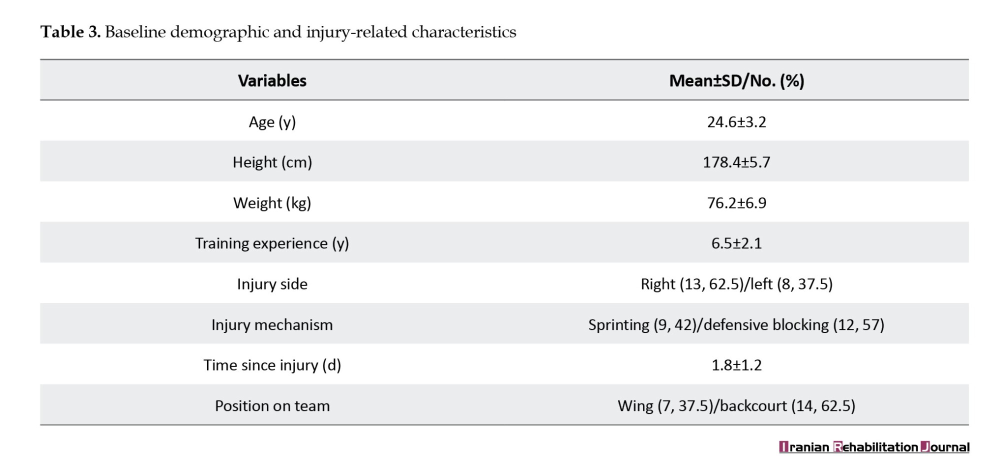 21 handball players (mean age: 24.6±3.2 years) with Grade I hamstring injuries were included in the study. Baseline demographic and injury-related characteristics are shown in Table 3. All subjects were competitive players in the Baghdad Premier League, with 6.5±2.1 years of competitive handball experience. Injuries were observed most frequently in the dominant limb (62.5%) in high-level defensive play or sprinting activities of play. Shapiro-Wilk test confirmed normal distribution of baseline data (P>0.05).