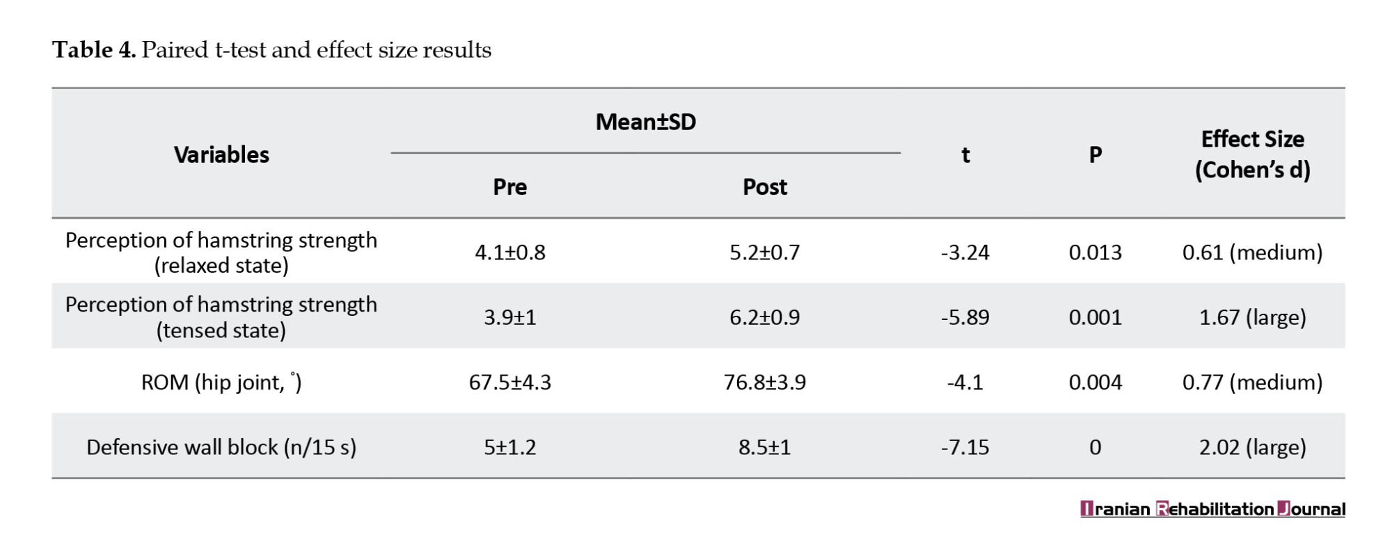 Significant improvements were found in all measured outcomes following the 8-week Swiss ball rehabilitation program. As shown in Table 4, perceived hamstring strength increased in both relaxed (pre: 4.1±0.8 → post: 5.2±0.7; P=0.013) and tensed states (pre: 3.9±1.0 → post: 6.2±0.9; P=0.001), hip joint range of motion improved (67.5±4.3° → 76.8±3.9°; P=0.004), and defensive wall block showed the greatest gain (5.0±1.2 → 8.5±1.0; P<0.001). Effect sizes ranged from medium to large, indicating strong practical relevance. These outcomes reflect the effectiveness of the structured Swiss ball rehabilitation protocol in enhancing hamstring strength, flexibility, and functional performance through progressive exercises that promoted faster recovery and improved neuromuscular control.