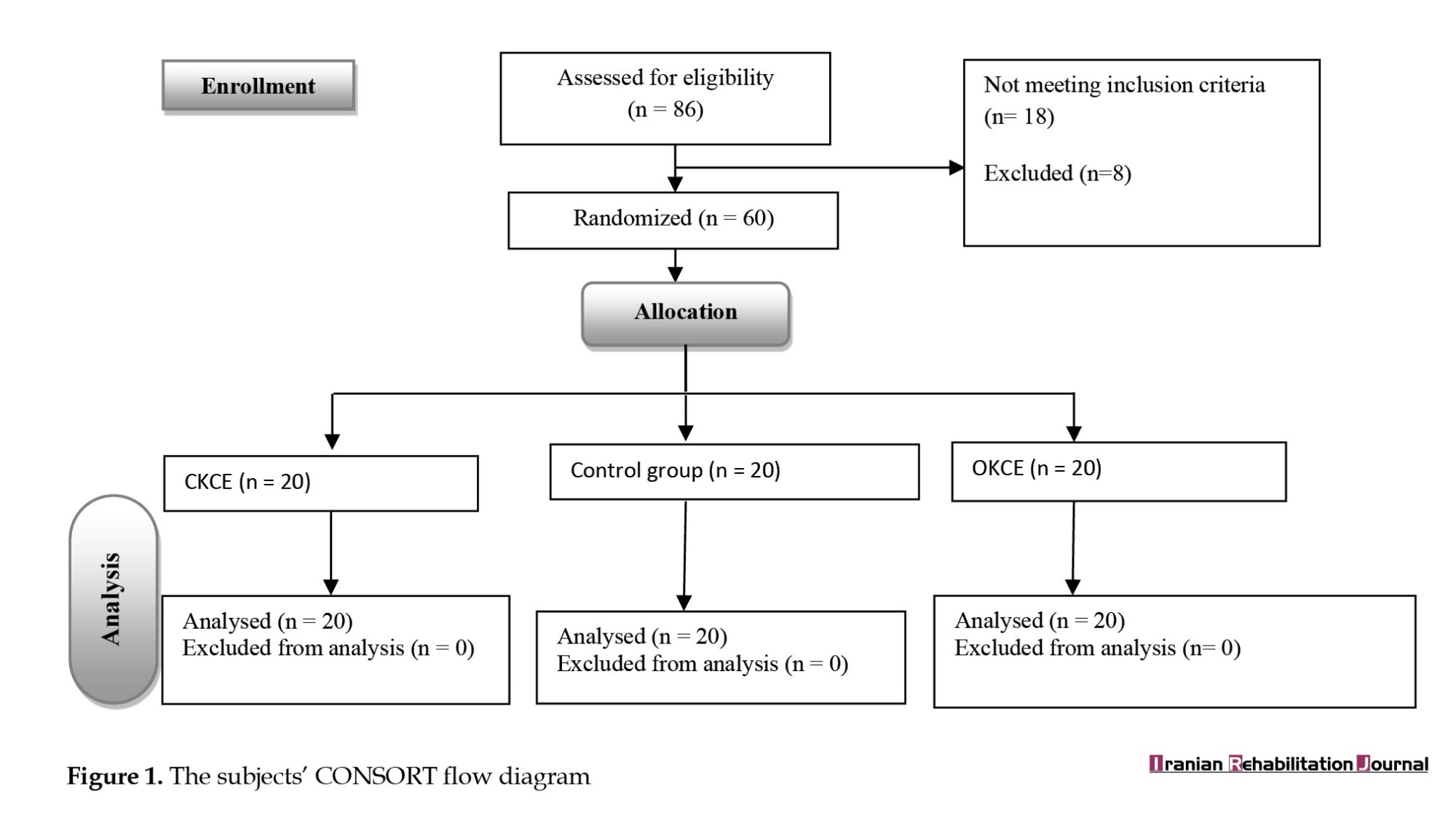 Participants in this study were men aged 40-60 years who had been diagnosed with CNSLBP by a spine specialist, they freely participated in the trial. They were assigned at random using sequentially numbered opaque sealed envelopes to hide their allocation, divided into three groups using software that generates random numbers: OCAE (n=20), CCAE (n=20), and a control group (n=20). In this random allocation method, based on the sample size, each of the randomly produced sequences was recorded on a card, which was then put into one of the prepared envelopes. Finally, after the evaluation, each patient opened one of the envelopes to specify their group. The minimum sample size was calculated utilizing G*Power software, version 3.1.9.2 (effect size=0.8, α=0.05, and power of the test=0.95) for multivariate analysis of variance, one-way analysis of variance (ANOVA) test, and and analysis of covariance (ANCOVA) (demographic information). The study included 86 men with LBP, of whom 18 were eliminated because they did not meet the inclusion criteria. Additionally, eight participants did not adhere to the rehabilitation process. Finally, based on the inclusion and exclusion criteria, 60 participants were chosen to make up the statistical sample. Ultimately, there were 20 patients with CNSLBP in the OCAE group, 20 in the CCAE group, and 20 in the control group (Figure 1). All patients had CNSLBP, which was confirmed by a neurosurgeon. The inclusion criteria included being aged 40-60, having a history of pain for over 12 weeks, and having no history of spinal surgery or hip replacement. The exclusion criteria included pain in other body parts, involvement in therapeutic activities, sciatic pain, lower and upper limb deformities, physiotherapy use throughout the past 12 months, and spondylolysis and respiratory problems [24]. The experimental groups performed CKCE and OKCE for eight weeks, three sessions per week, while the control group received no intervention. Patients were instructed not to inform the evaluators about their group assignments to preserve blinding. The participants were provided with an explanation of the processes and goals. Under the Declaration of Helsinki, all participants and/or their legal guardians provided informed consent before participating in the study and, when appropriate, before information or photos were published in an online open-access publication [25]. Ethical approval was obtained from the Ethics Committee o Bu-Ali Sina University for this study. The study was registered at the Iranian Registry of Clinical Trials (IRCT).
