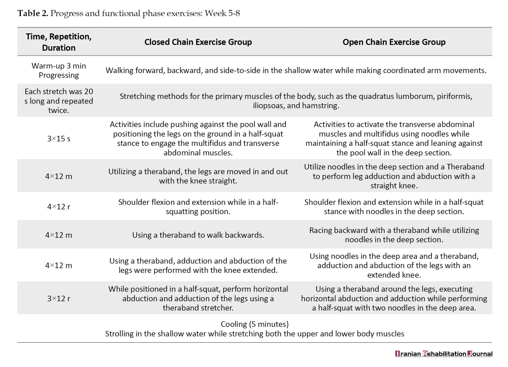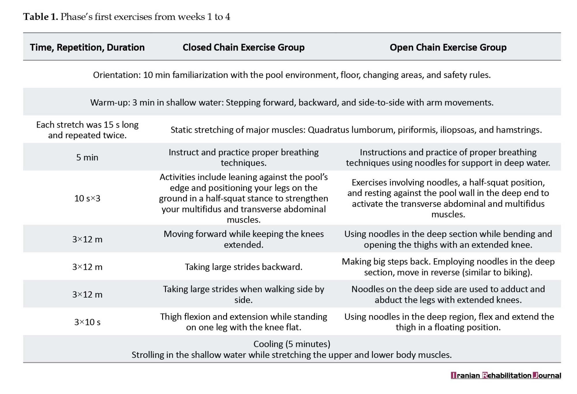 After evaluating the listed variables, exercises were performed for eight weeks in two stages. The first stage (first four weeks) aimed to familiarize participants with water, examine breathing patterns, train and perform breathing correctly, use swimming in a pool to strengthen the transverse abdominal muscles and multifidus, and maintain proper posture and breathing throughout daily activities (Table 1).