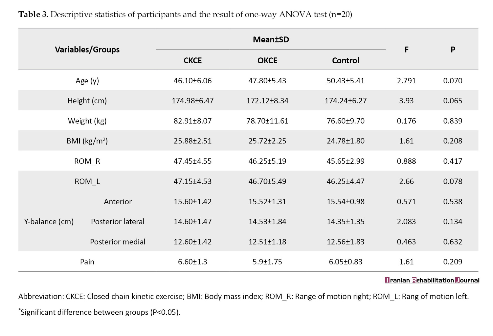 Demographic characteristics, such as age, height, weight, and body mass index (BMI), were reported as Mean±SD (P>0.05) (Table 3). At baseline, no statistically significant differences were observed between the groups regarding demographic characteristics (age, weight, height, BMI) or outcome measures (ROM, dynamic balance, and pain), (P>0.05 for all) (Table 3).
