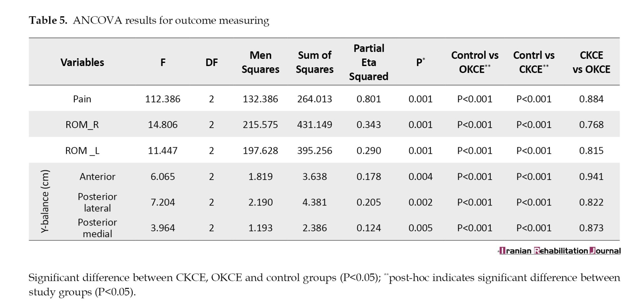 Data pertaining to all three groups were collected in the pre-test, post-test, and statistical analysis was then carried out to examine how CKCE and OKCE affected study indicators. The Shapiro-Wilk test was used to assess the η2 normal distribution of data related to variables and demographic characteristics, and the Levene test was used to assess the homogeneity of variances. Analysis of variance (ANOVA) was used to compare the pre-test values of groups, the t-dependent test to examine intra-group differences, and the ANCOVA method was used to compare the post-test values between groups with effect size analysis. Data were analyzed using SPSS software, version 26. The significance level was set at 0.05 (P<0.05). The effect of the interventions was considered using eta coefficients (η2): Low (0.01), medium (0.06), and large (0.14).