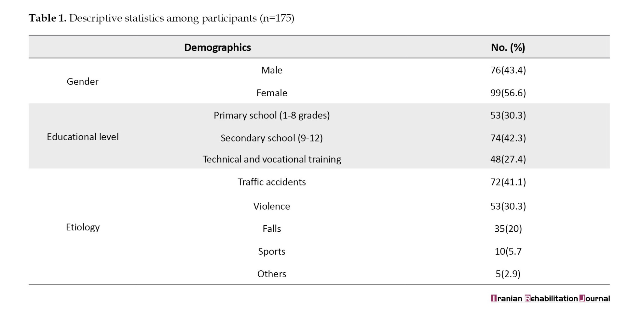 The mean age of the participants was 40.23±5.522 years (min 28 and max 45 years). The gender distribution was 76(43.4%) males and 99(56.6%) females. The etiology of SCI varies. Traffic accidents were the most common cause, 72(41.1%), and violence was the second most prevalent etiology, 53(30.3%). Falls contributed to 35(20%), while sports-related incidents comprised 10(5.7%). The educational level of the study participants was primary school education (1-8 grades) among 53 individuals (30.3%). Secondary school education (9-12 grades) was the most common, with 74 individuals (42.3%). Additionally, 48 individuals (27.4%) had undergone technical and vocational training (Table 1).
