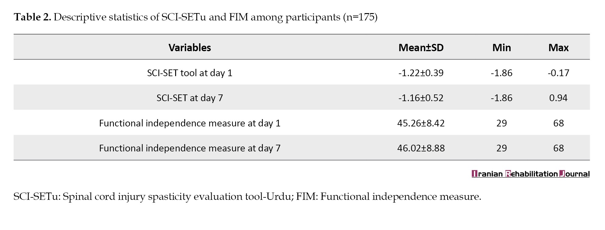 The descriptive statistics for SCI-SETu, on day 1, ranged from -1.86 to -0.17, with a mean of -1.22±0.39. The FIM scores on day 1 ranged from 29 to 68, with a mean of 45.26±8.42 (Table 2).