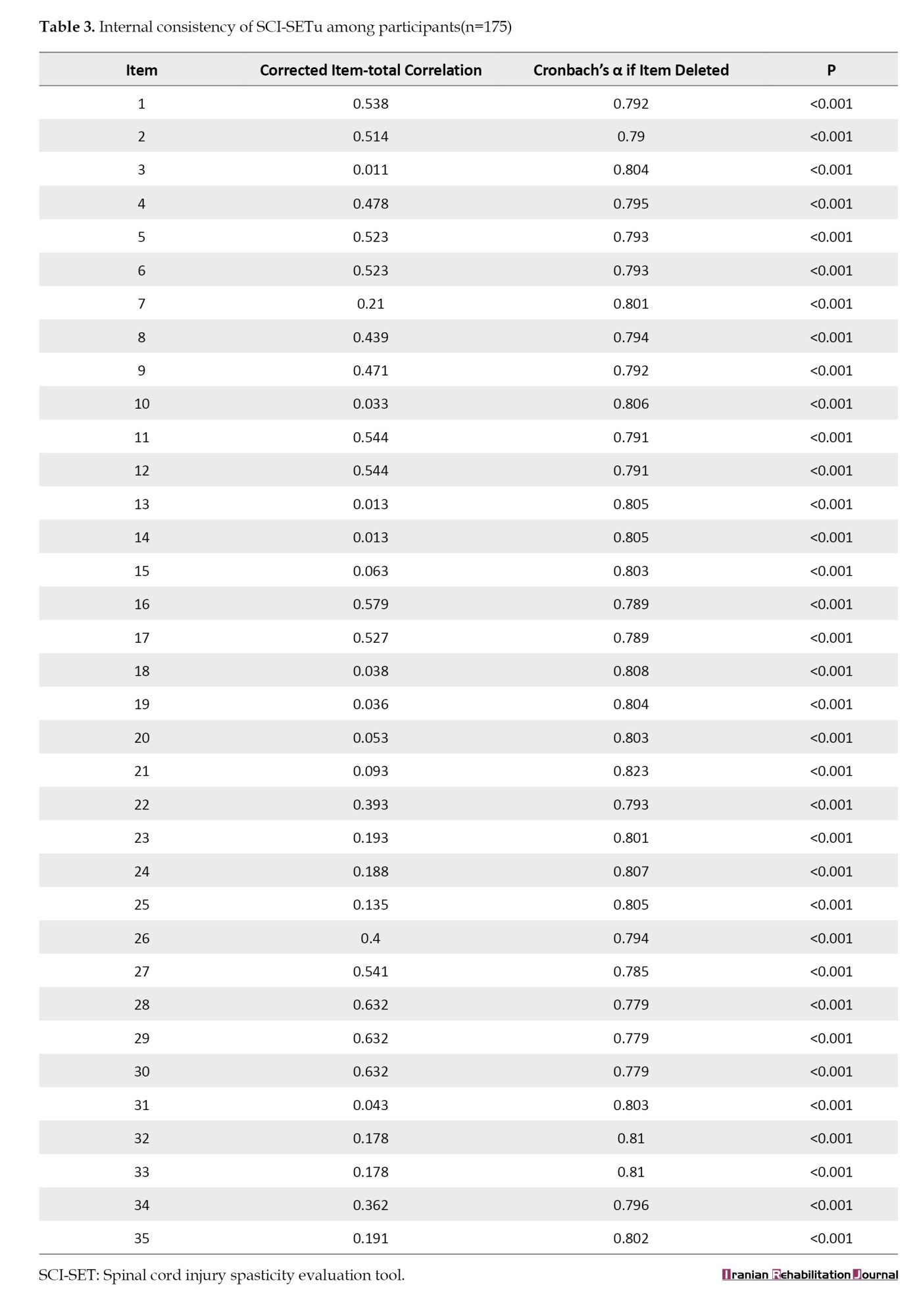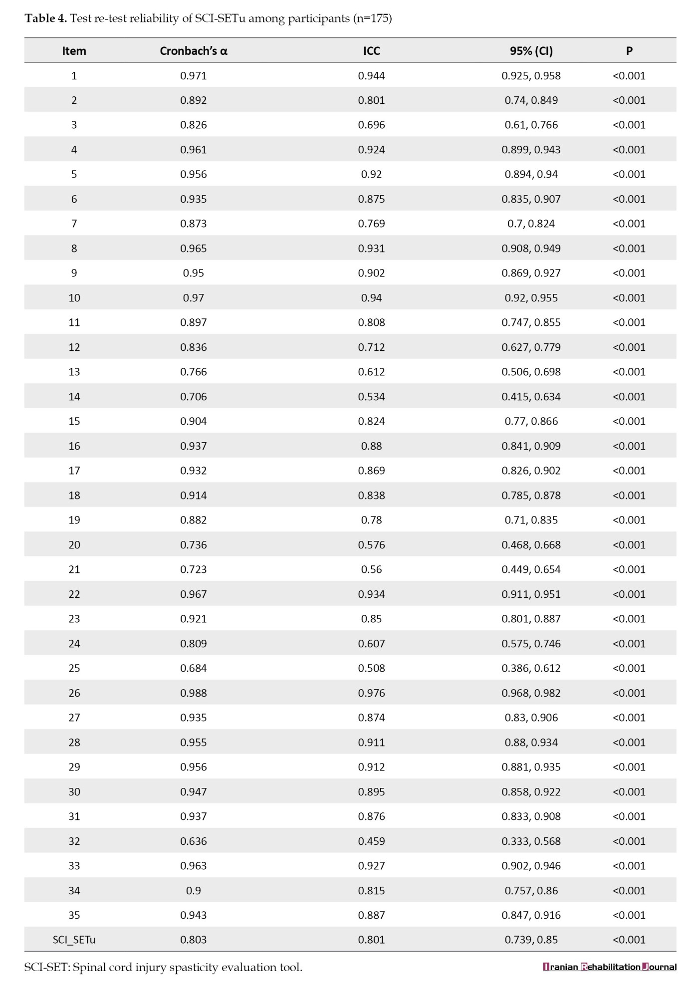 The translation of the SCI-SET into Persian (SCI-SETp) and validation process revealed strong psychometric qualities, with a Cronbach’s α of 0.862 and an ICC agreement for test re-test reliability of 0.84. These indicators demonstrate high internal stability and consistency over time. Our research found comparable results for the Urdu translation, with Cronbach’s α values ranging from 0.779-0.823 and ICCs ranging from 0.459-0.976. These findings indicate that the SCI-SETu is a valid instrument for assessing spasticity in patients with SCI, while retaining the original SCI-SET’s reliability and validity [20].