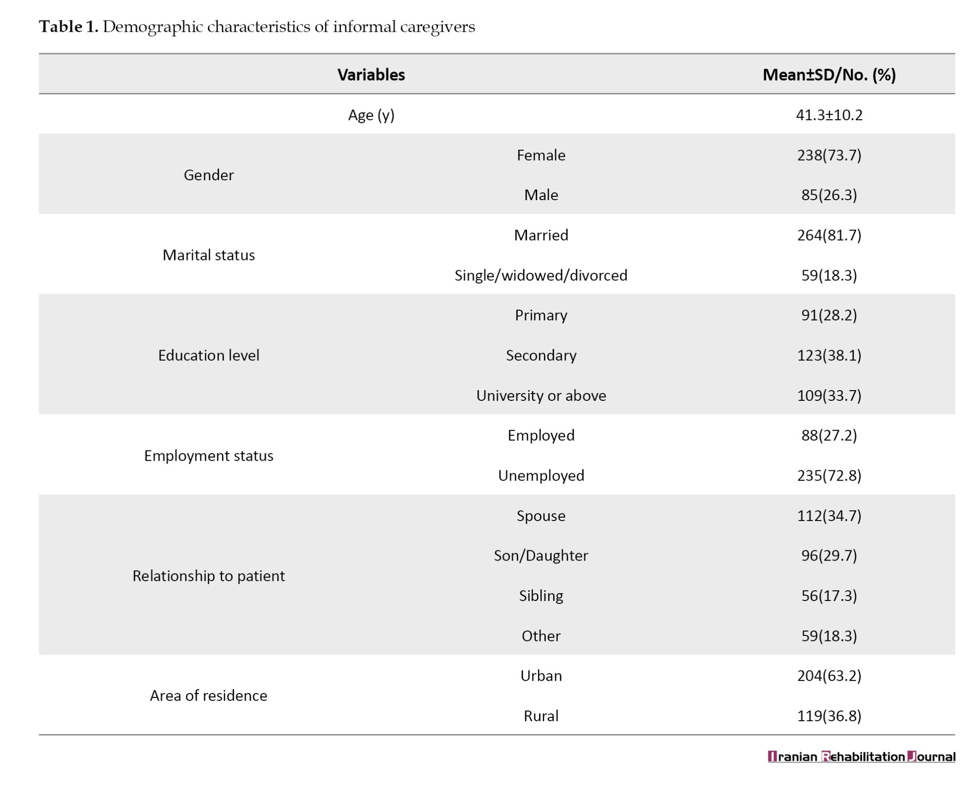 Table 1 presents the demographic characteristics of the informal caregivers. The Mean±SD age of the caregivers was 41.3±10.2 years. Most caregivers were female (73.7%) and married (81.7%). Educational attainment varied, with 38.1% having completed secondary education and 33.7% holding a university degree or higher. A significant portion (72.8%) was unemployed, potentially reflecting the demands of caregiving. The most common relationship to the patient was spouse (34.7%) and child (29.7%). Geographically, most caregivers resided in urban areas (63.2%).