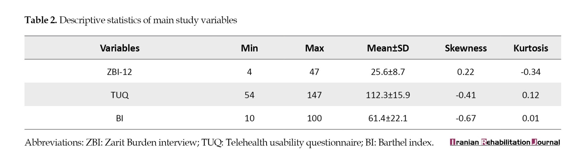 Table 2 presents the descriptive statistics for the ZBI-12, TUQ, and BI. The mean caregiver burden score (ZBI-12) was 25.6, suggesting moderate burden levels. The TUQ yielded a mean score of 112.3, indicating generally positive perceptions of telehealth. The BI averaged 61.4, reflecting a moderate level of functional independence among patients. The skewness and kurtosis values suggested that the data were approximately normally distributed, supporting parametric statistical analyses.