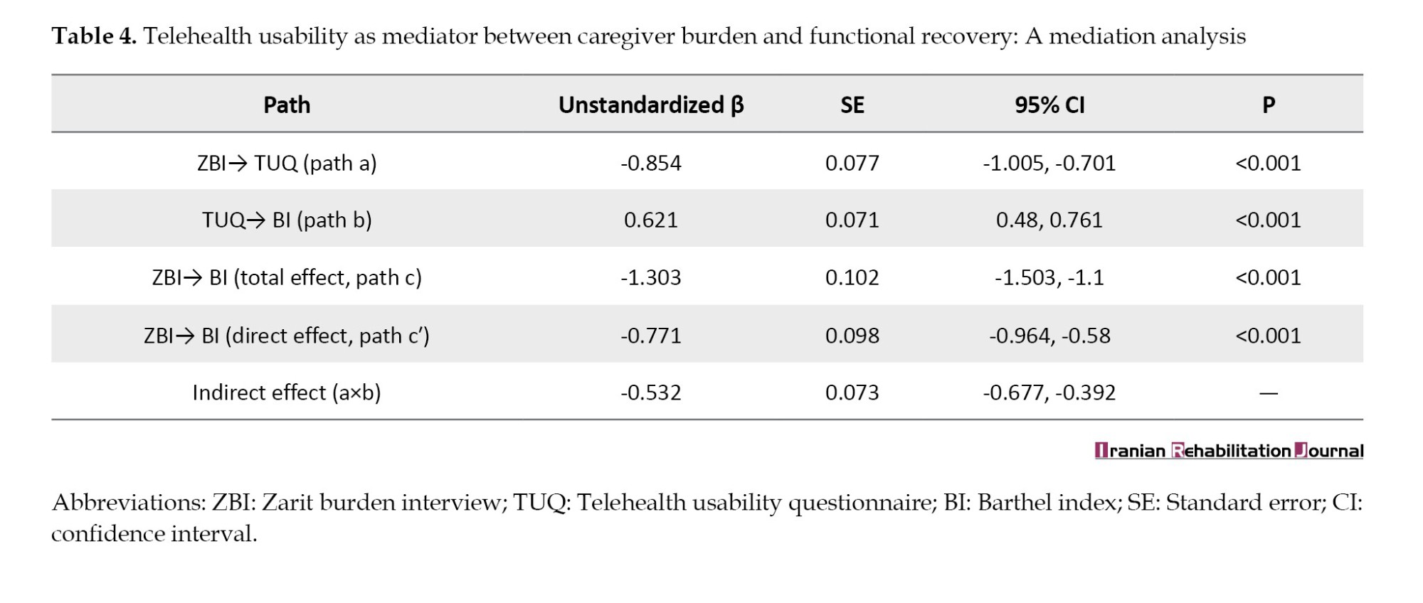 Table 4 presents the results of mediation analysis. All path coefficients were statistically significant. The indirect effect (a×b=-0.532) was significant (P<0.001), indicating partial mediation, suggesting that telehealth usability plays a role in the relationship between caregiver burden and functional recovery. The direct effect of caregiver burden on functional recovery (c′=-0.771) remained significant (P<0.001), implying that caregiver burden also independently influenced recovery outcomes.