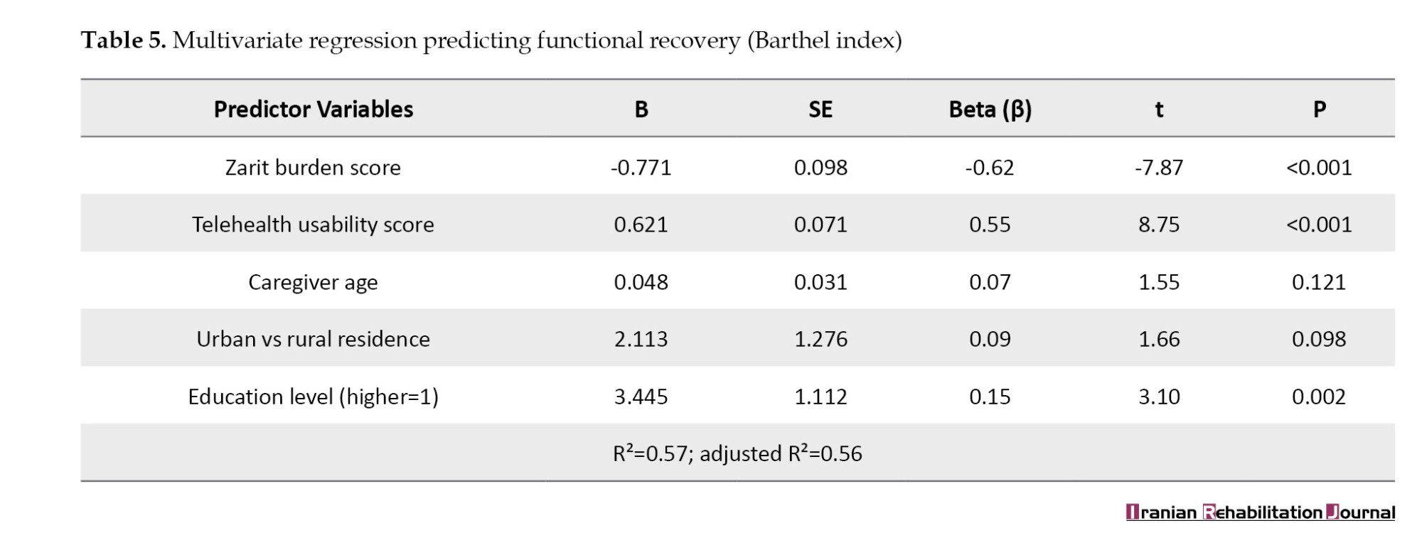 Table 5 presents the results of a multivariate linear regression predicting functional recovery (BI). Both caregiver burden (β=-0.62, P<0.001) and telehealth usability (β=0.55, P<0.001) were strong predictors of functional recovery. Higher education level was also a significant positive predictor (β=0.15, P=0.002). Caregiver age and area of residence were not significant predictors in this model. The overall model explained 57% of the variance in functional recovery (adjusted R²=0.56), indicating substantial predictive power.