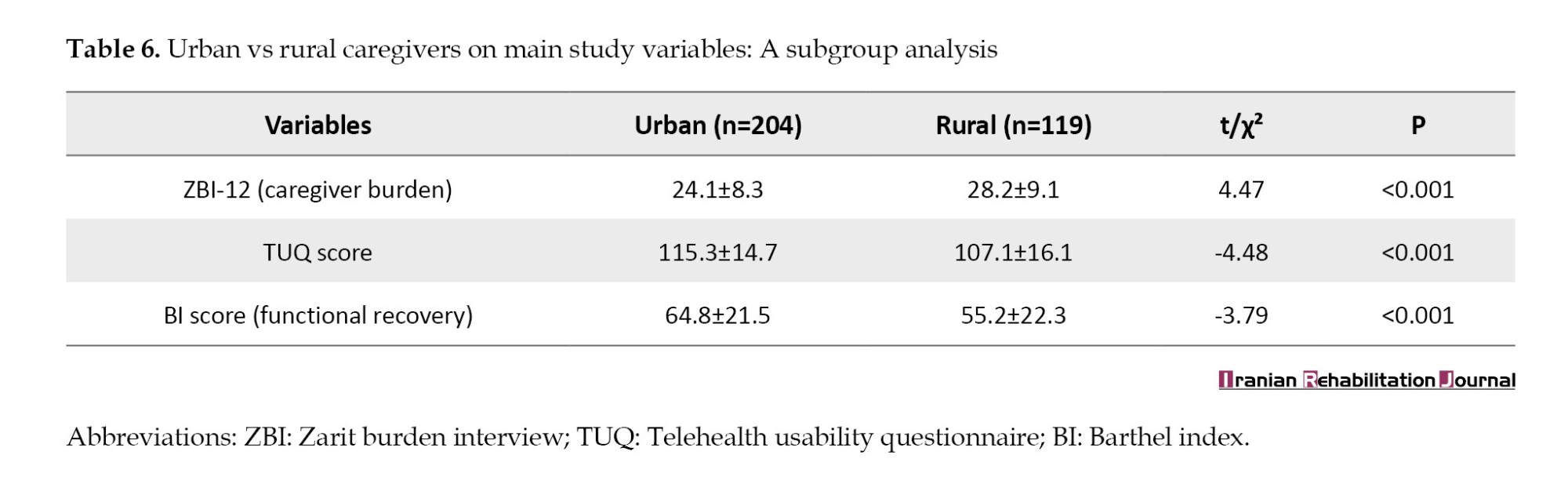Table 6 compares the caregivers based on their areas of residence. Rural caregivers reported significantly higher burden (ZBI=28.2 vs 24.1, P<0.001), lower telehealth usability scores (107.1 vs 115.3, P<0.001), and their patients exhibited poorer functional recovery (BI=55.2 vs 64.8, P<0.001) compared to urban caregivers. These findings highlight disparities in caregiving experiences and outcomes based on geographic location.