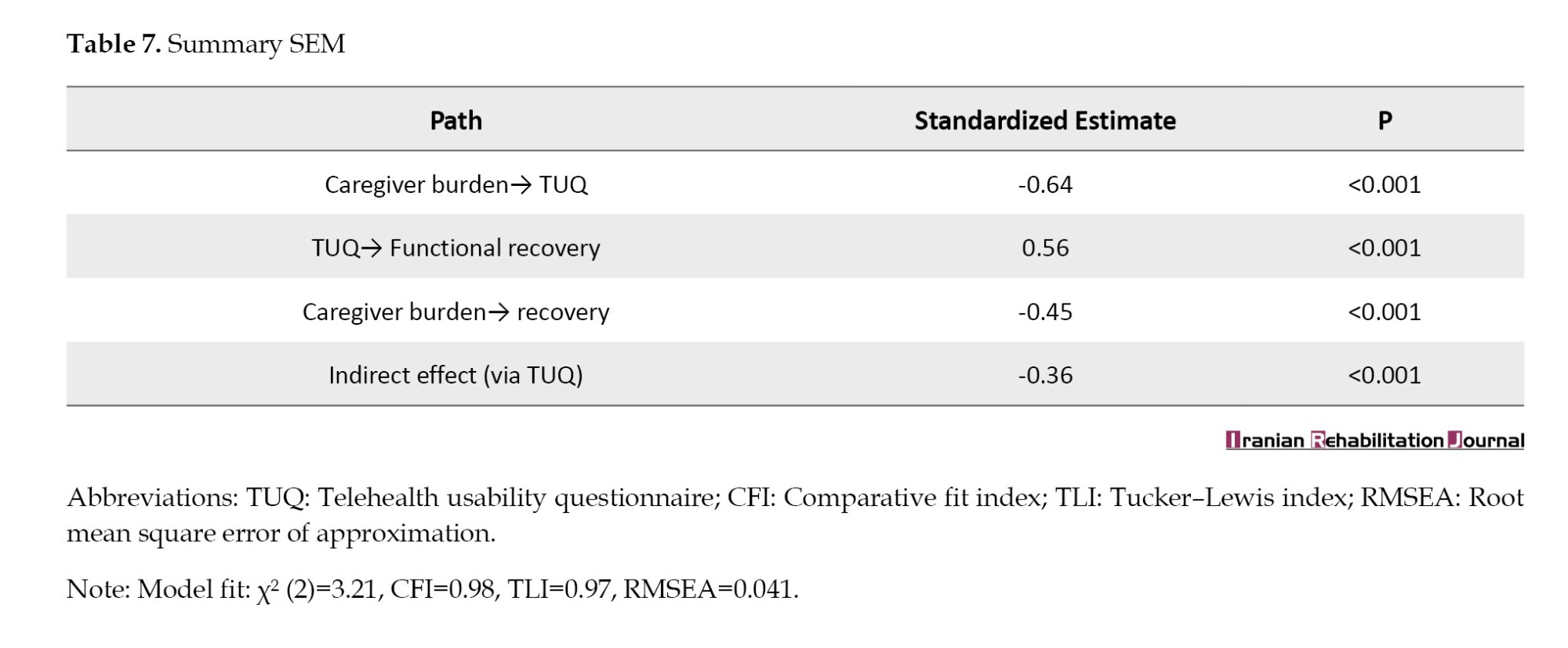 Table 7 presents the results of the structural equation modeling (SEM). The model indicated that caregiver burden had a significant negative direct effect on functional recovery (β=-0.45, P<0.001) and a significant negative indirect effect via telehealth usability (indirect β=-0.36, P<0.001). Telehealth usability positively influenced functional recovery (β=0.56, P<0.001), and caregiver burden negatively impacted telehealth usability (β=-0.64, P<0.001). The model fit indices (comparative fit index [CFI]=0.98, Tucker–Lewis index [TLI]=0.97, root mean square error of approximation [RMSEA]=0.041) suggest an excellent fit, supporting the proposed mediation framework.